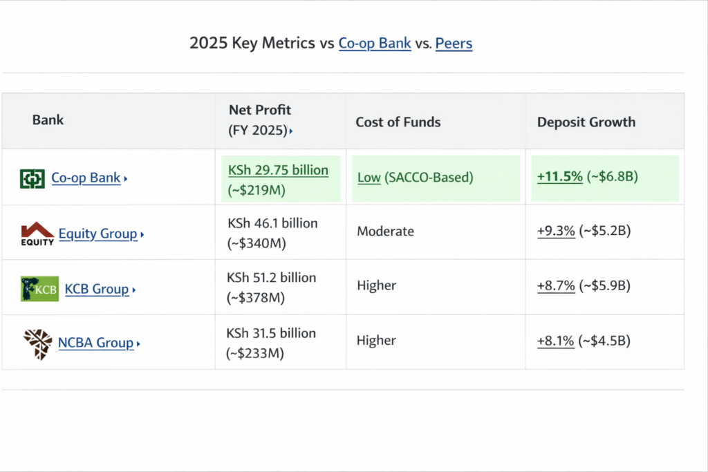 Co‑op Bank Kenya leverages SACCO deposits for low‑cost funding, stable margins and record 2025 earnings, outperforming peers in resilience and profitability.